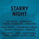 La Starry Night fortrylle deg med sine luksuriøse og komplekse noter. Fra det første hintet av sprudlende sitrus som vekker sansene, til den varme og innbydende duften av krydder som fyller luften, og til slutt de dyptgående og rike undertonene av edle treslag som gir en følelse av varme og trygghet – denne duftoljen er en hyllest til nattens skjønnhet og mysterium.